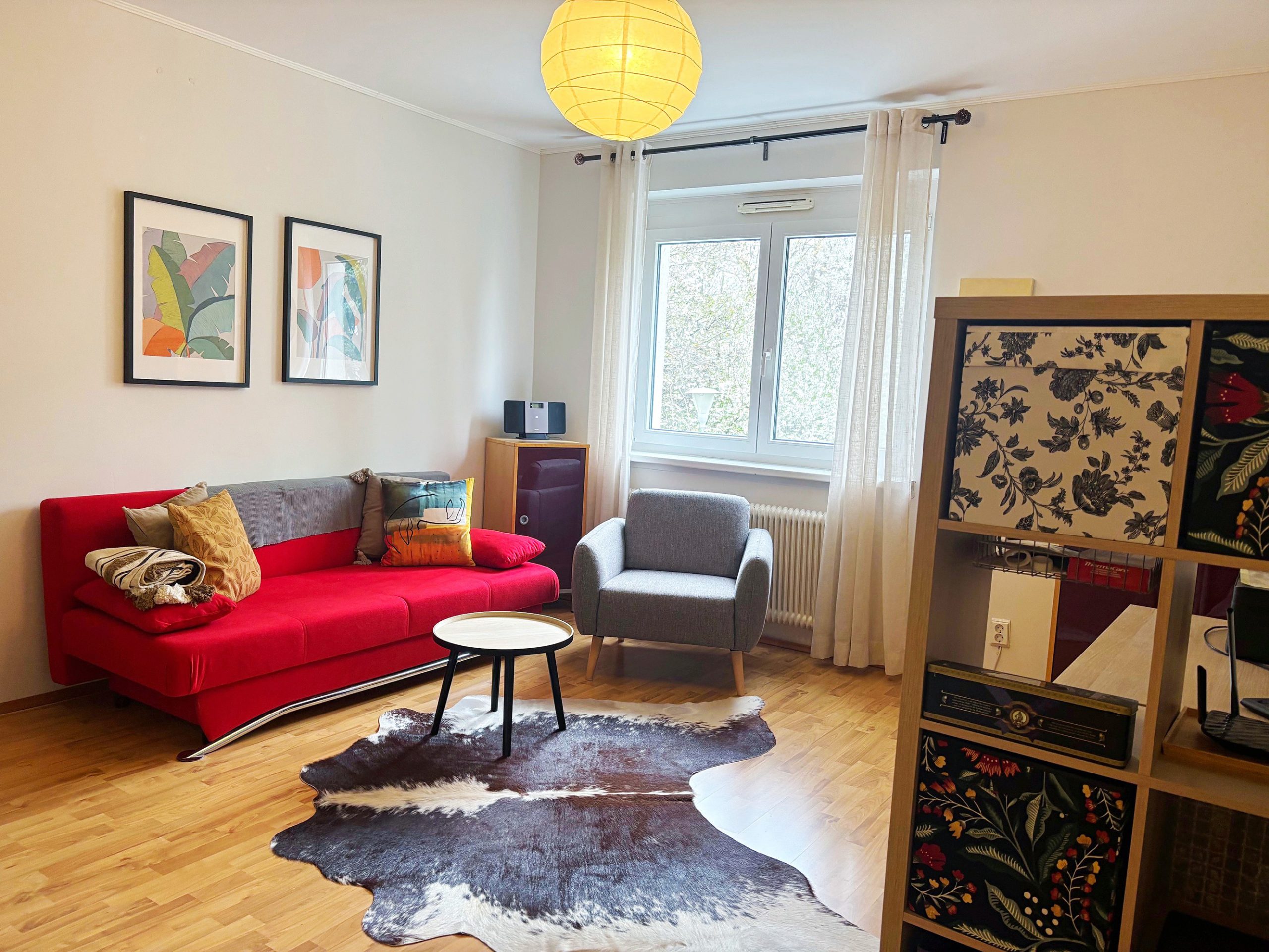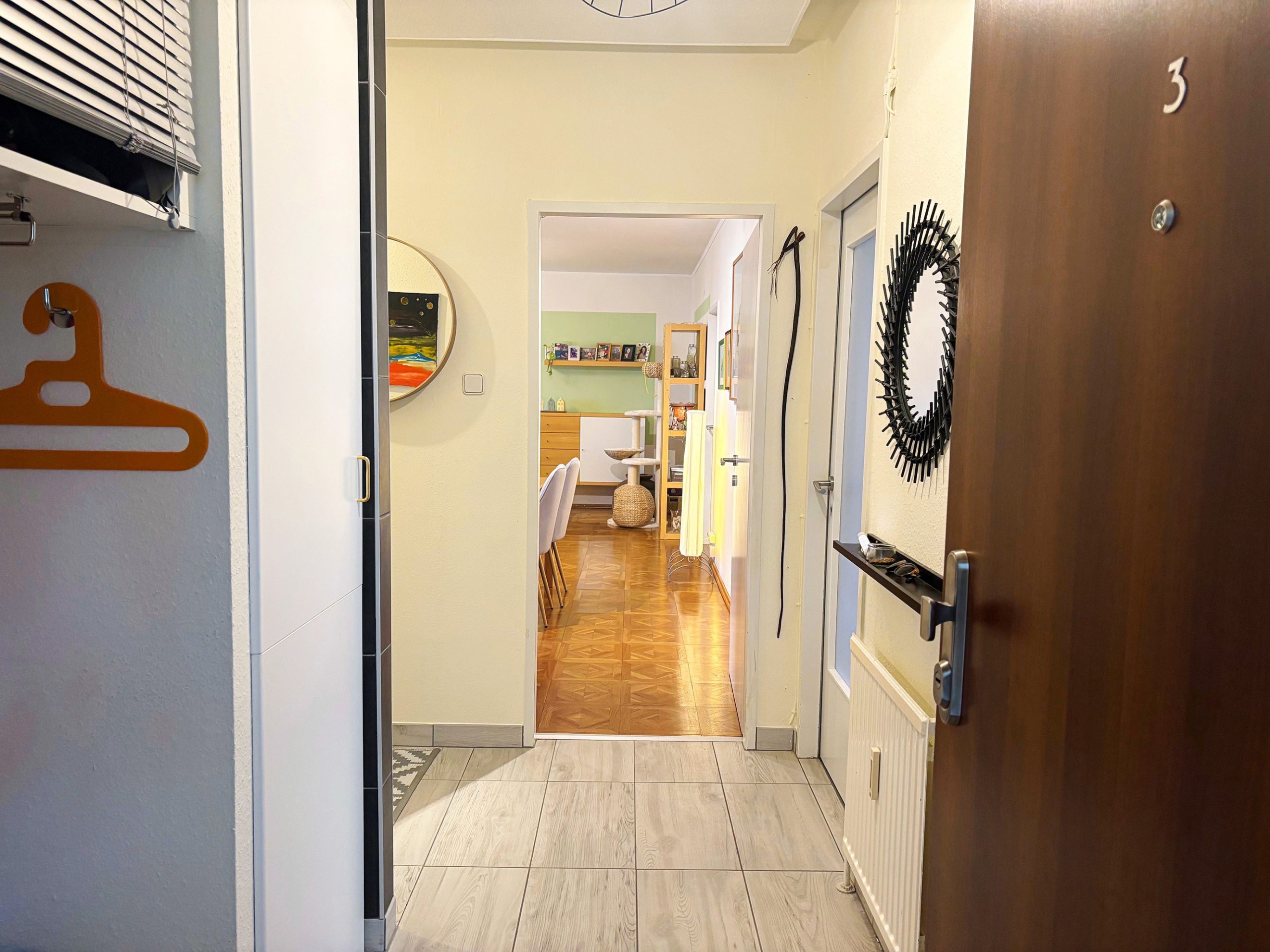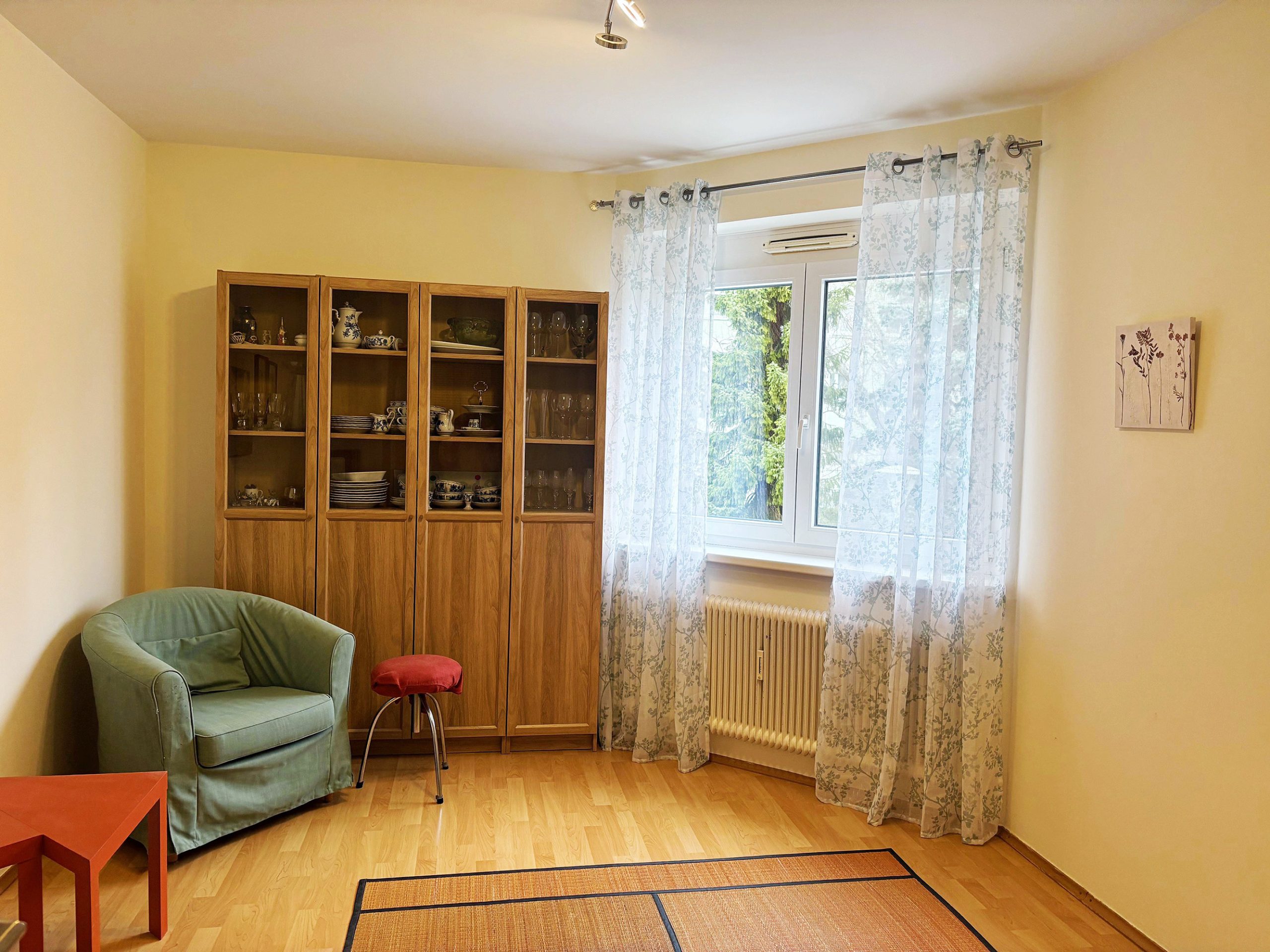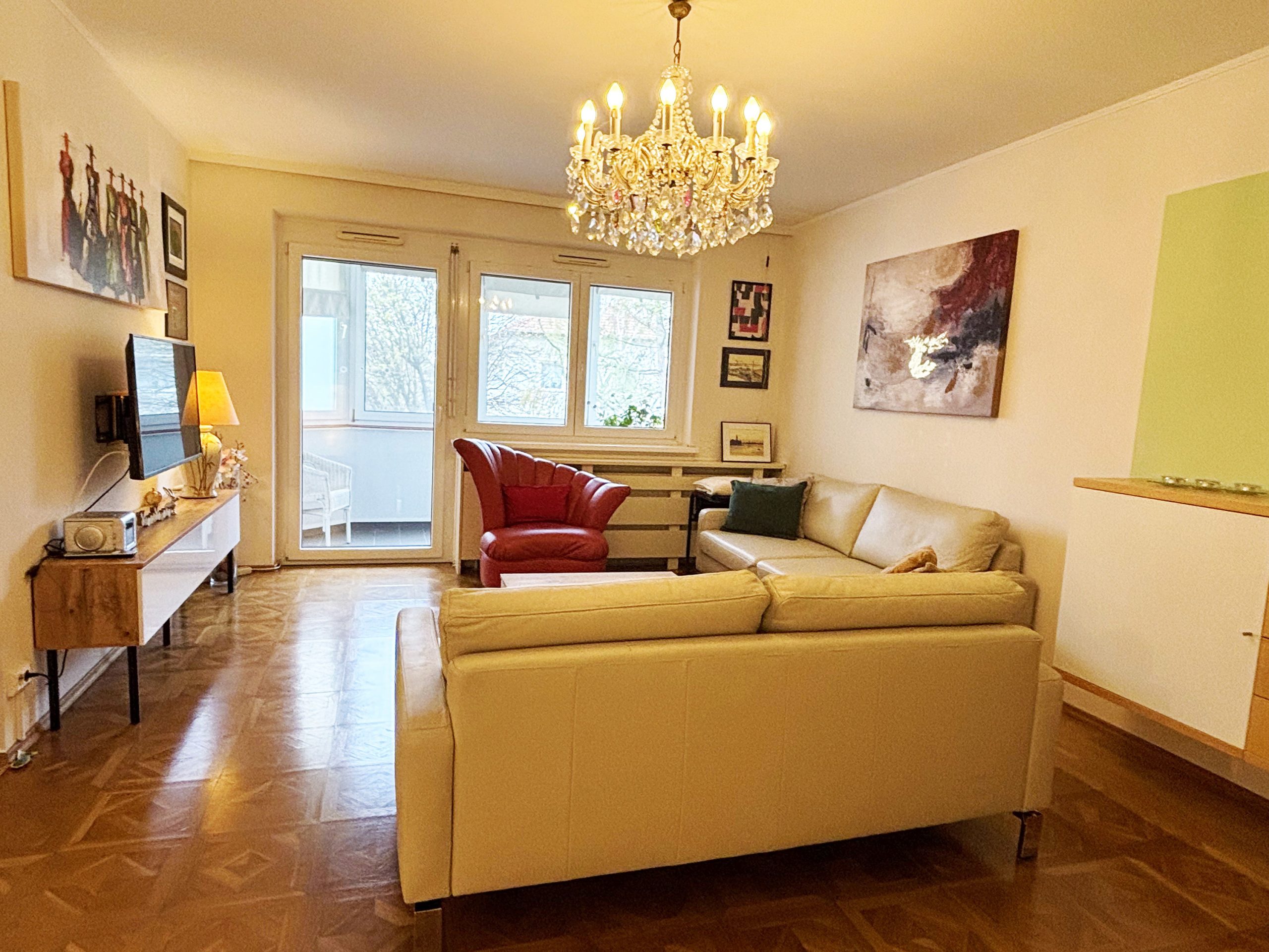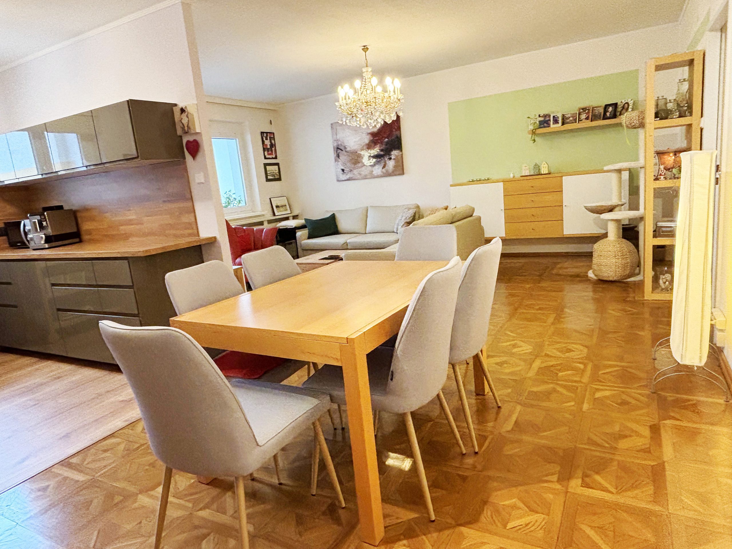 Die Wohnung teilt sich auf wie folgt: neben dem Eingangsbereich mit Garderobenplatz befinden sich zwei der getrennt begehbaren Zimmer. Auch der Abstellraum, das Bad und das WC sind vom Vorraum aus getrennt begehbar. Weiter geht es zum großzügigen Wohn/Essbereich – dem Herz der Wohnung. In der im Herbst 2025 neu eingebauten Ikea-Küche macht das Zubereiten von köstlichen Speisen viel Freude (Vorteil: man kann die Küche bei Ikea nach Belieben erweitern). Der Parkettboden im Wohnzimmer hat ein Tafel-Design und lässt den Raum besonders wirken. Auf der 5,3 m² großen, mit Fenstern geschlossenen Loggia kann man mit schönem Grünblick einen Café oder Tee genießen und die Seele baumeln lassen. Vom Wohnzimmer aus gelangt man in das 4. Zimmer.