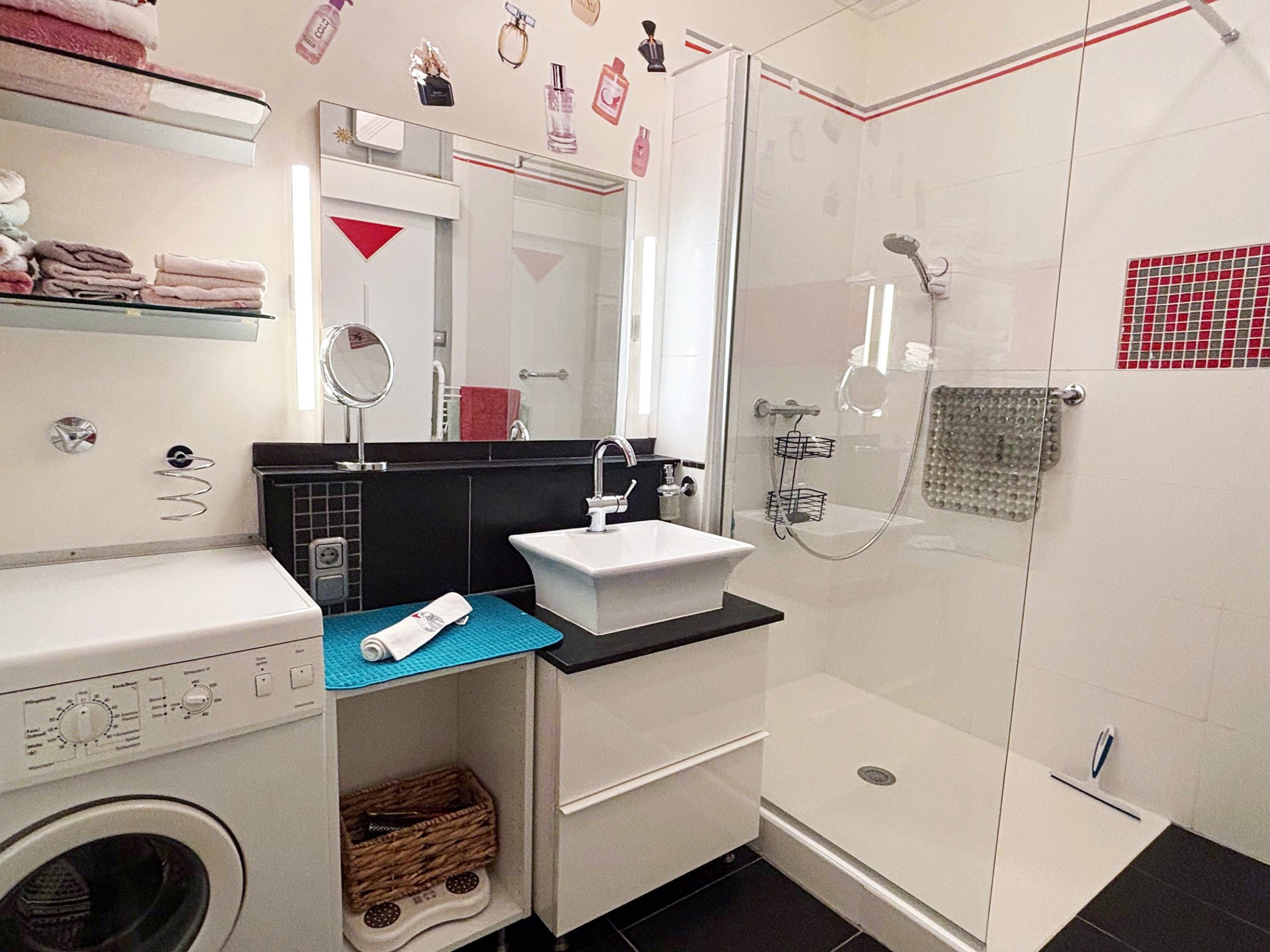 Das Badezimmer verfügt über eine begehbare Dusche (ca. 117 cm x 90 cm) und Platz für einen Waschtisch und die Waschmaschine.